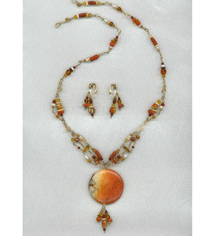 14K yellow gold filled necklace with large Apple Coral pendant. Accompanying beads include Amber, Bone, Coral, Carnelian, Horn, and Pearls.