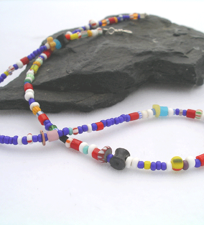Securely strung African trade beads with sterling silver findings makes for a beautiful necklace for girl or boy.