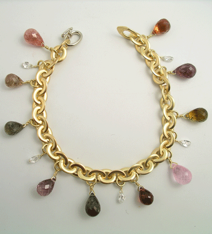 A rainbow of Sapphires accented by diamond briolettes. 18KY gold.