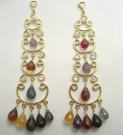 Intensely colored Sapphires are paired with antique diamonds in these long swinging 18K yellow dangle earrings.