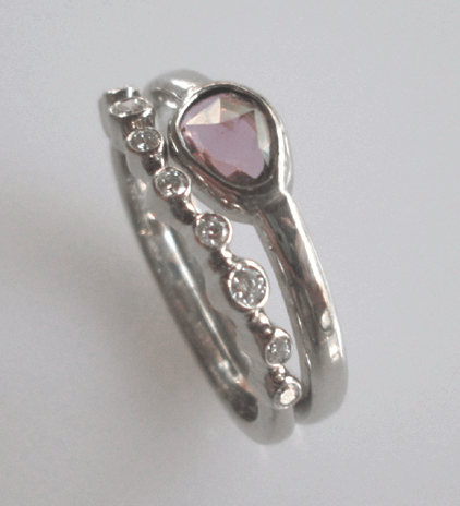 14K white gold, rose cut lavender Sapphire, and diamonds.