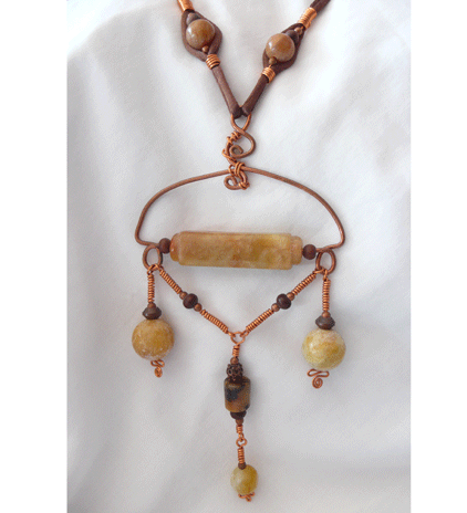 Various Serpentine within a copper wire pendant accented with copper beads and brown silk cord.
