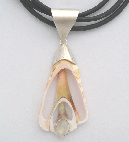 Sliced shell, Moonstone, and sterling silver creation.