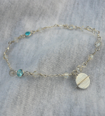 Handmade Saturn accented by clear and aqua crystals, sterling silver.