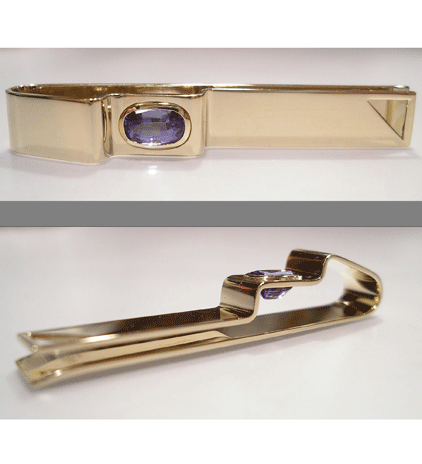 14K yellow gold tie bar with a beautiful Tanzanite bezel set.